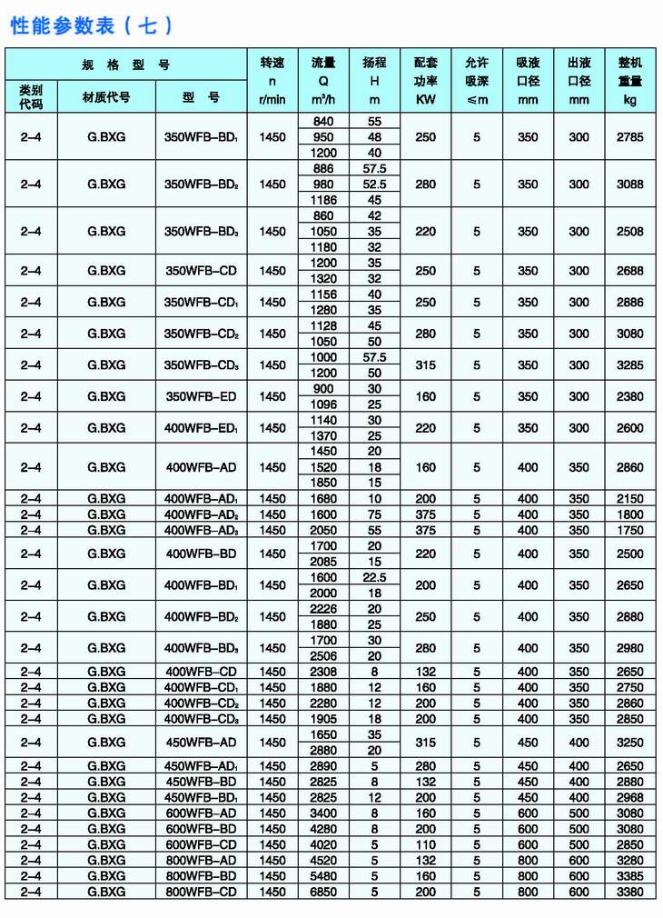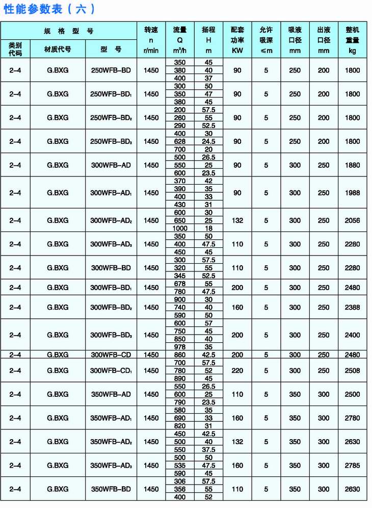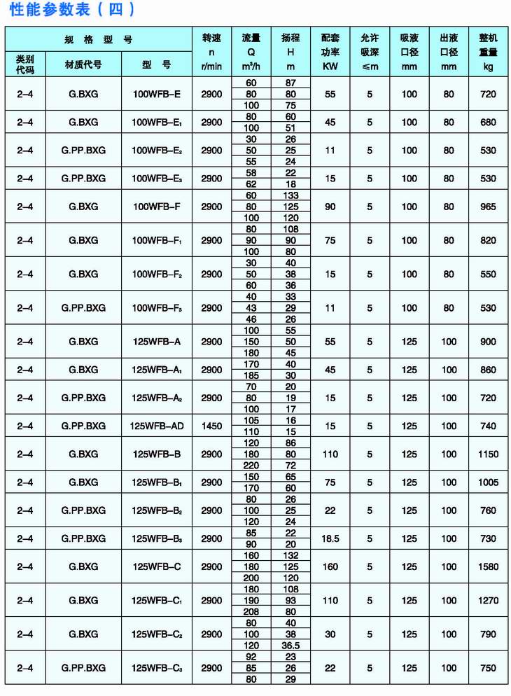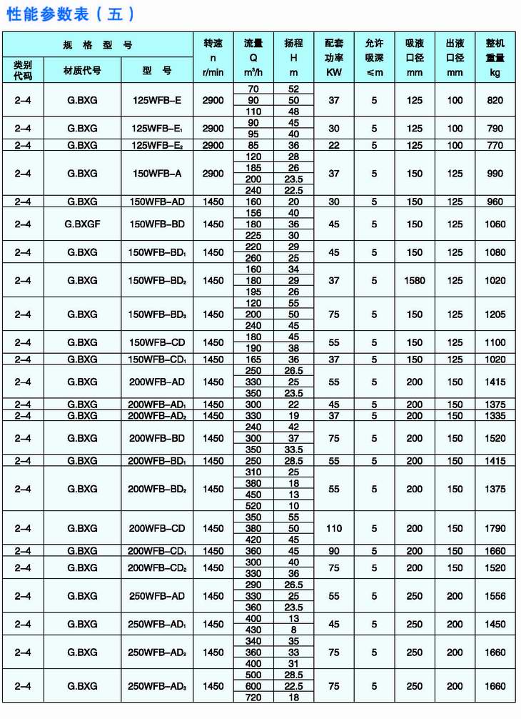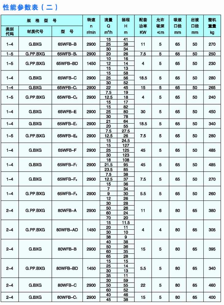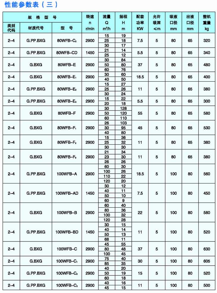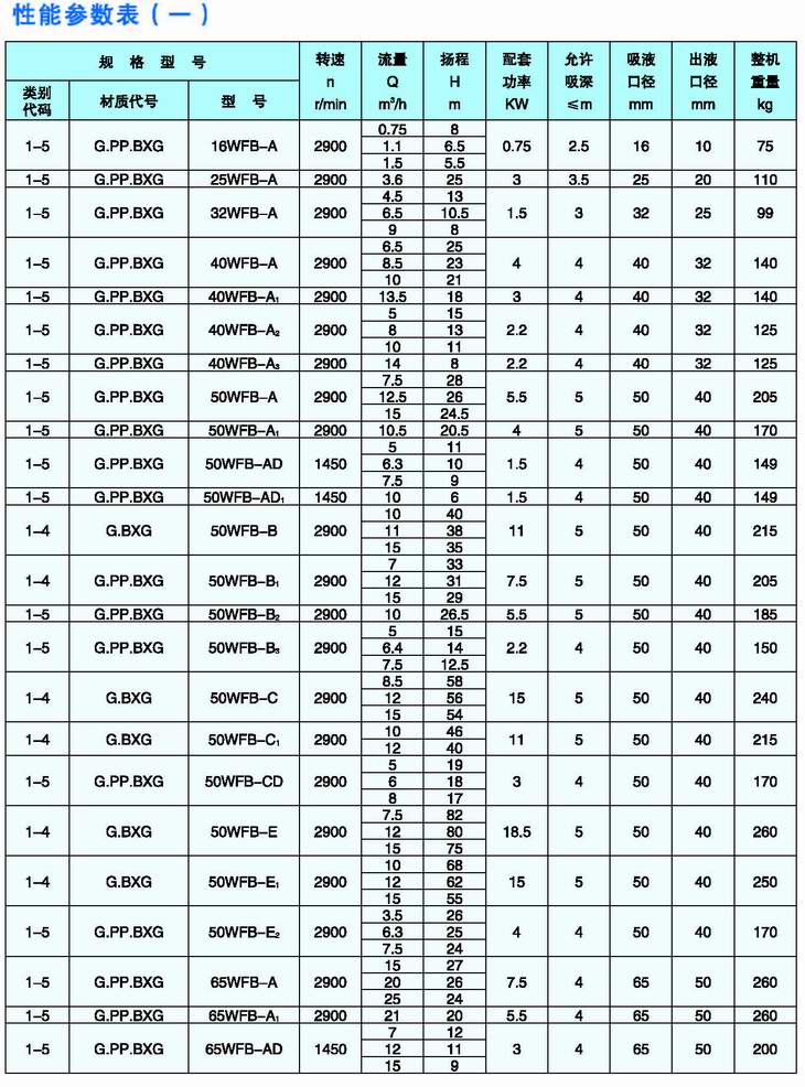 3.完整的型號書(shū)寫(xiě)方式。假設水泵的要求是:造型為推車(chē)型,材質(zhì)為增強聚丙烯,吸液口徑為50mm,性能分類(lèi)為AD1。這臺水泵的完整型號為“5PP50WFB-AD1”